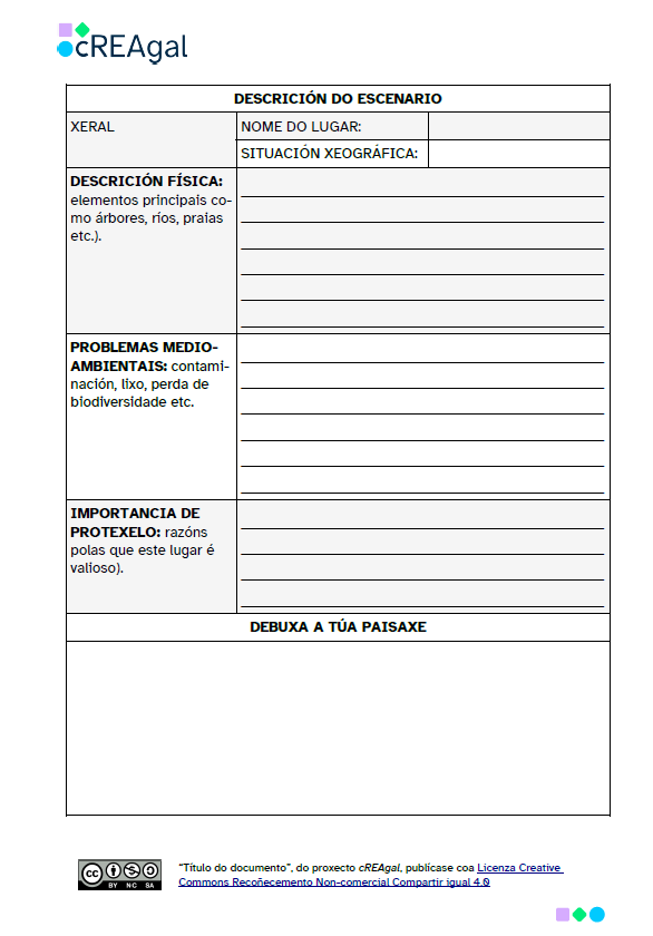 O escenario. Escollede un lugar especial da vosa contorna (praia, bosque, vila…) e recreádeo cunha descrición rica en detalles e cunha reflexión sobre os retos ambientais que enfronta.