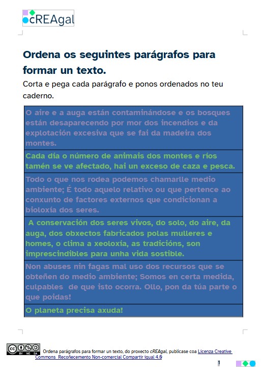 REA da materia de Lingua e Literatura Galega de 6º de primaria. Correspóndese coa unidade didáctica 3, da programación modelo de PROENS publicada pola Consellería de Cultura, Educación, Formación Profesional e Universidades. Xunta de Galicia. Nesta situación de aprendizaxe, partindo dalgún problema medioambiental, detectado no seu entorno próximo, o alumnado traballará cos diferentes tipos de textos narrativos para crear unha misión para un videoxogo ou un vídeo viral. |