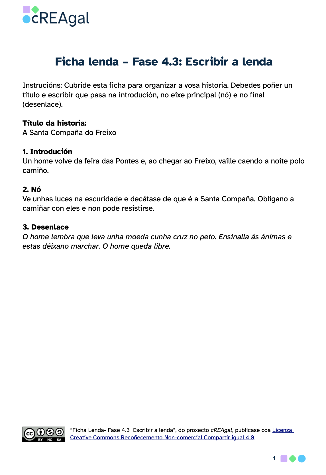 Neste reto, o grupo escribirá a súa lenda completa. Será o momento de reunir todo o traballo feito ata agora: personaxes, lugar, emocións e estrutura. Cada grupo poderá crear unha lenda orixinal ou recoller unha que coñeza, organizándoa nas tres partes principais dunha narración: introdución, nó e desenlace.