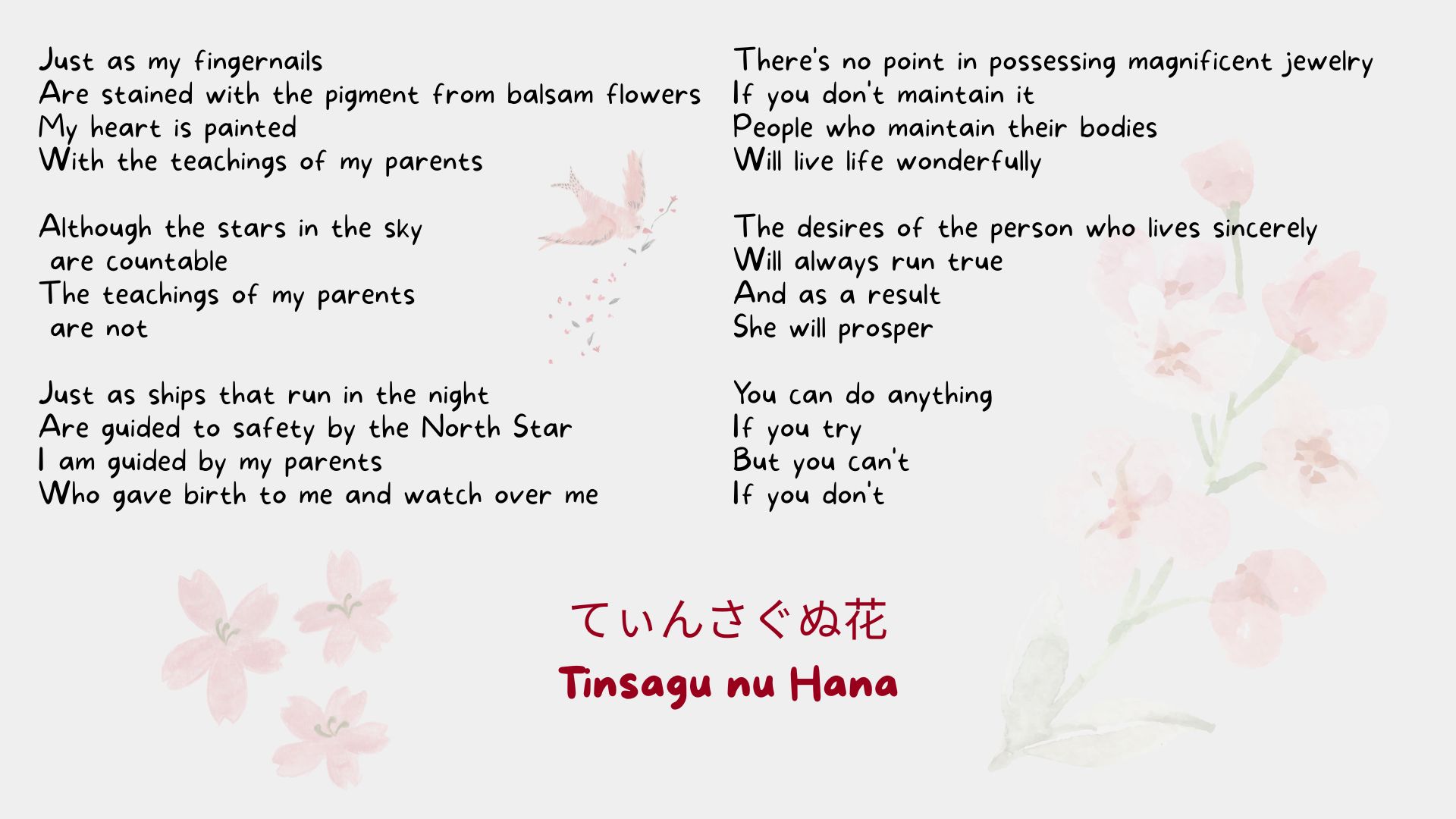 Tinsagu nu Hana (also Chinsagu nu Hana, The Balsam Flowers) is an Okinawan traditional children's song, which became Okinawa Prefecture's Official Favorite Song in 2011. The song is written in Ryūka, a form of traditional Okinawan poetry that originated in the Ryukyu Islands. A Ryūka generally follows an 8-8-8-6 syllable pattern and is usually accompanied by a sanshin, an Okinawan string instrument.