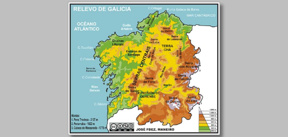 Seguidamente figura un mapa físico de Galicia no que aparecen as principais serras e elevacións montañosas.