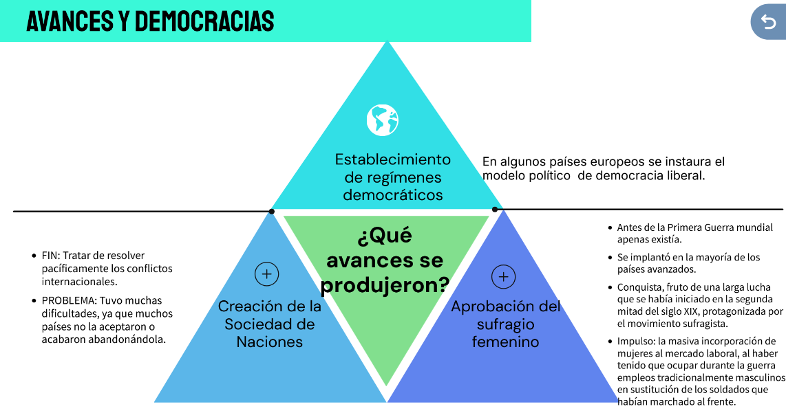- El sufragio femenino (es decir, el derecho de la mujer a votar y a ser votada), que antes de la Primera Guerra mundial apenas existía, se implantó en la mayoría de los países avanzados. Esta conquista era el fruto de una larga lucha que se había iniciado en la segunda mitad del siglo XIX y que fue protagonizada por el movimiento sufragista. El proceso fue estimulado ahora por la masiva incorporación de mujeres al mercado laboral, al haber tenido que ocupar durante la guerra empleos tradicionalmente masculinos en sustitución de los soldados que habían marchado al frente.