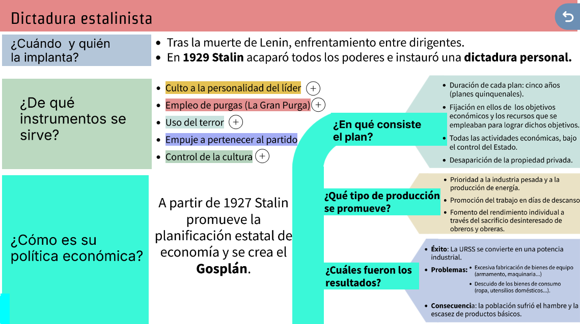 Tras la muerte de Lenin en 1924 la dirección pasa a un grupo de dirigentes. Los enfrentamientos entre ellos eran continuos. En 1929 Stalin acaparó todos los poderes e instauró una dictadura personal que se inspiró en cuatro instrumentos: