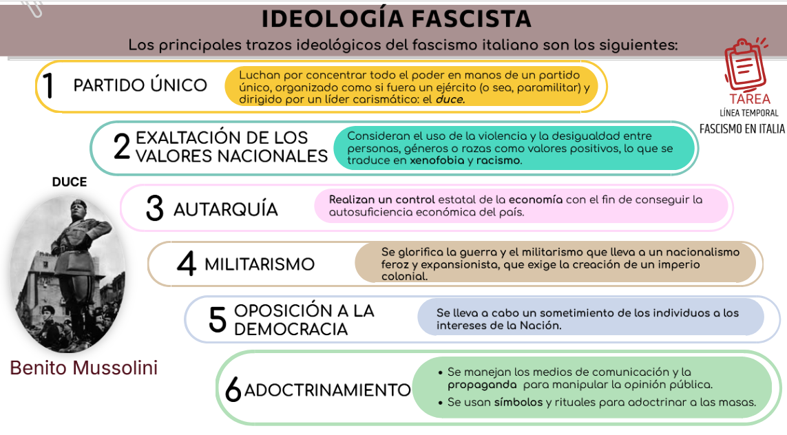 Surge, pues, en Italia el fascismo italiano, que da nombre al movimiento. Su líder, Benito Mussolini, un antiguo socialista, creó el Partido Nacional Fascista. El fascismo se desarrolló gracias al clima de descontento que había entre los italianos por la inestabilidad política y por las fuertes tensiones sociales entre el movimiento obrero y los empresarios.