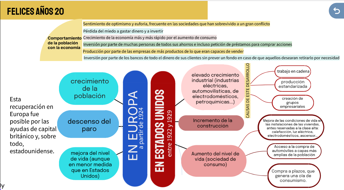 Tras el esfuerzo inicial de reconstrucción se produjo un sentimiento de optimismo y euforia, frecuente en las sociedades que han sobrevivido a un gran conflicto. Se perdió el miedo a gastar dinero y a invertir. Al aumentar el consumo, la economía siguió creciendo más y más rápido. Esa euforia llevó a llamar al período "Felices años 20". Muchas personas invirtieron todos sus ahorros e incluso pidieron préstamos para comprar acciones. Las empresas comenzaron a producir más de lo que eran capaces de vender. Y los bancos invirtieron todo el dinero de sus clientes sin prever un fondo en caso de que aquellos desearan retirarlo por necesidad.
